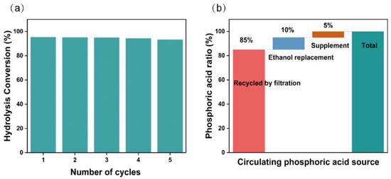 ‘Green’ and sustainable production is widely recognized by human society [63]. If the final production quality is not disturbed, the reuse of reagents for pretreatment can significantly reduce the cost. The H3PO4 mixture was reused five times for subsequent pretreatment of bagasse with the appropriate addition of H3PO4, and the resulting glucose yield of pretreated bagasse via enzymolysis was similar to that of the fresh reagent (Figure 7a). Approximately 85% of the H3PO4 is recycled directly by filtration, ~10% H3PO4 is recovered from ethanol washing solution via rotary evaporation, and only ~5% H3PO4 needs to be replenished for reuse (Figure 7b). Residual H3PO4 (~5%) in pretreated bagasse almost obviated the need for acid to adjust the pH to 4.8 to meet the requirements of the enzymatic hydrolysis process. Further research will be conducted to recover acid-soluble lignin from the H3PO4 mixture to further improve the reuse potential of H3PO4.