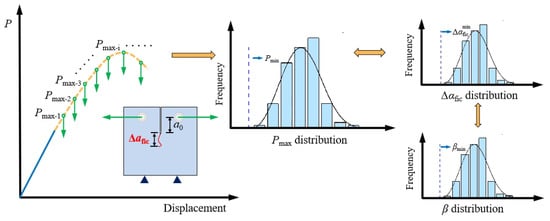 A previous experimental study on the subject revealed that, since the same batch of PMMA bone cement specimens with the same size and loading procedure were used on the same equipment, the recorded peak load maintained its discreteness []. As illustrated in Figure 1, the fictitious crack growth in PMMA bone cement specimens of the same size was discrete due to the random distribution of material particles, which caused the unpredictability of . This meant that separation was the key feature of PMMA bone cement. The variation dispersion coefficient is introduced in the current paper to investigate this discreteness, and Equation (1) was utilized to establish the relationship between the fictitious crack growth and the average particle size at the peak load []. As shown in Figure 2, the three-parameter Weibull distribution function was used to characterize the distribution characteristics of the variation dispersion coefficient to assess the statistical characteristics of the fracture strength of PMMA bone cement. Further, and related to match the three-parameter Weibull distribution.