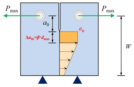 Wedge-splitting specimens (WS) [,], three-point bending specimens [], and chevron-notched short-rod specimens [,,] are commonly used in laboratory testing to examine the fracture parameters of PMMA bone cement. The tensile strength of PMMA bone cement was obtained through four-point bending specimens [] and dumb-bell specimens [,]. A large number of experiments are required to obtain the necessary parameters, which increases costs and the time required for the experiments. It is proposed in this section that the BEM model be adapted to PMMA bone cement specimens; thus, the two parameters of fracture toughness and tensile strength can be calculated simultaneously only based on WS test results. In this paper, the distribution form of the nominal stress at the crack tip was assumed to be rectangular [], as shown in Figure 3. Furthermore, the BEM considering the variation dispersion coefficient , the average aggregate size , and the peak load is given in Equation (7) [,,,].