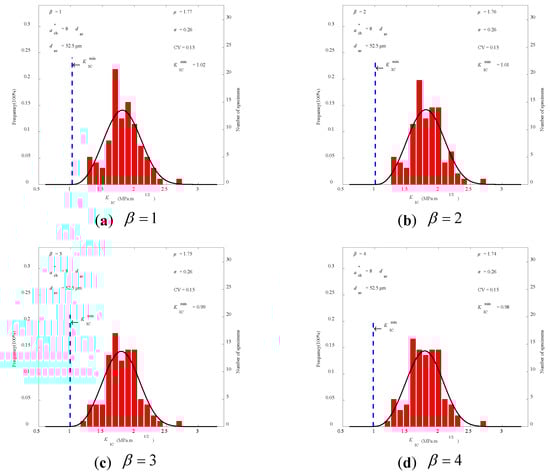 A specific quantity of the experimental sample data set is needed to test the validity of the statistical analysis results. In this paper, experimental data from PMMA bone cement wedge separation samples by Merta were selected for analysis as a data set []. The geometric information of the specimens and the test results of the load peak value are presented in Table 2. The width B of the test specimens was 6 mm. The (the ratio of to W) variation range of the specimen height W (= 15 mm) was 0.13~0.53. The (the ratio of to W) variation range of the specimen height W (= 22 mm) was 0.09~0.64. The (the ratio of to W) variation range of the specimen height W (= 29 mm) was 0.07~0.69. The (the ratio of to W) variation range of the specimen height W (= 36 mm) was 0.05~0.81. For each combination of and W, 5 to 9 specimens were produced, with a total of 160 specimens, and all specimens with cracks larger than 2 mm were removed, thus leaving 96 specimens. The numbering rule for specimens in this paper is E + “height” + “-initial crack length” for the convenience of expression. As an example, E15-2 represents a specimen with a height of 15 mm and a 2 mm initial crack length. In the analysis, the constant C was taken as 0.5, 1, 1.5, 2, 2.5, 3, 4, 5, 6, 8, 9, and 10, respectively; adopted the constant method to take a value (= 1, 2, 3, 4). According to reports in the relevant literature, the aggregate size d of PMMA bone cement ranges from 5 to 100 40, with average aggregate size equal to 52.5 . Fracture toughness and tensile strength were calculated according to Equations (16) and (17). The statistical distribution results of fracture toughness and tensile strength were then obtained using the three-parameter Weibull distribution function.