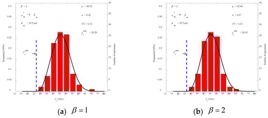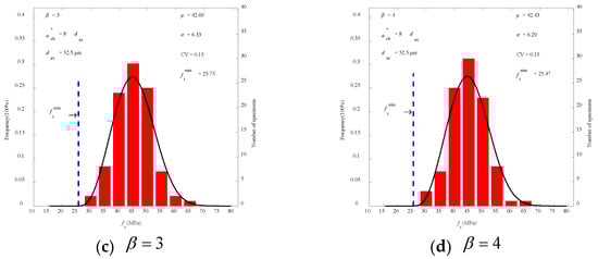 Individual fracture toughness and tensile strength can be calculated according to C, , , , and the geometric parameters of the specimens, as seen from Equations (16) and (17). The dispersion coefficient , fictitious crack growth , and peak load all provide the three-parameter Weibull function distributions. Therefore, tensile strength and fracture toughness also provide the three-parameter Weibull function distributions. Additionally, the mean value and standard deviation of the statistical distribution for PMMA bone cement strength fracture parameters were obtained according to Equations (5) and (6).