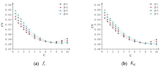 Variation curve of coefficient of variation for fracture toughness and tensile strength with C value at .