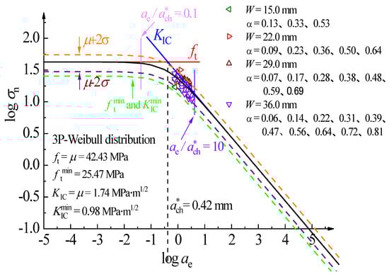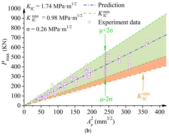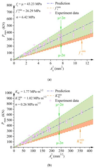 Figure 7 depicts the predicted results of the 95% confidence interval () of the PMMA bone cement WS specimen based on the mean value and standard deviation. By analyzing the minimum value, the lower limit of the material parameter was determined. As shown in Figure 7, the PMMA bone cement WS data points in the laboratory experiments are all in the quasi-brittle fracture control zone and above the lower limit fracture failure curve fitted by the minimum value. Almost all experimental data are within the 95% confidence interval.