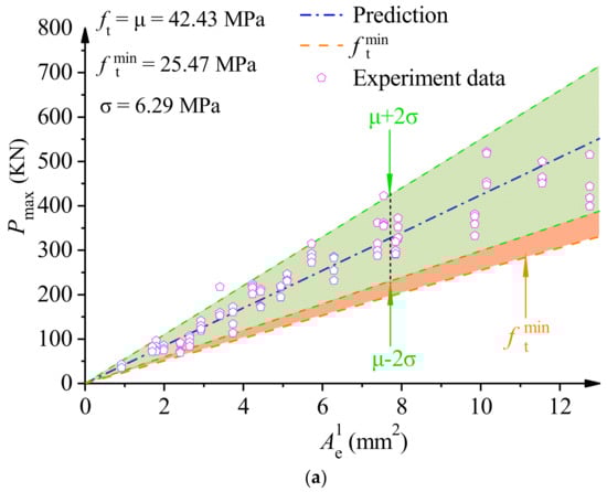 By transforming Equations (16) and (17), a simplified prediction model for the tensile strength and fracture toughness of PMMA bone cement WS specimens can be obtained. Tensile strength and fracture toughness , with respect to the equivalent area and the peak load , can be obtained as shown in Equations (18) and (19). Conversely, the peak load of the test piece can also be calculated from the equivalent area and (). Mean value and standard deviation of fracture strength parameters were obtained according to three-parameter Weibull distribution statistics. As shown in Figure 8, the predicted results of the peak load for the PMMA bone cement WS specimen with a 95% confidence interval () were obtained at the lower limit of the prediction of peak load . As can be seen in Figure 8, the vast majority of data are within the 95% confidence range, and all experimental data were above the minimum fit’s lower limit prediction curve.