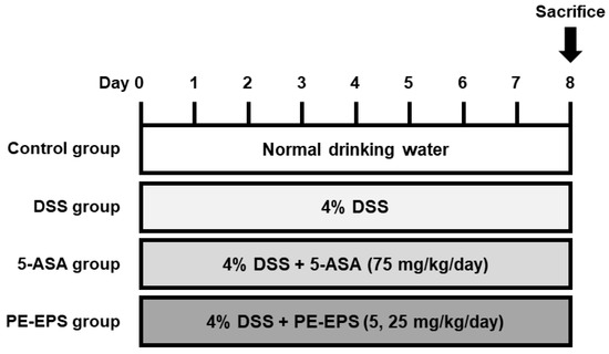 - Chung, K.S.; Shin, J.S.; Lee, J.H.; Park, S.E.; Han, H.S.; Rhee, Y.K.; Cho, C.W.; Hong, H.D.; Lee, K.T. Protective effect of exopolysaccharide fraction from Bacillus subtilis against dextran sulfate sodium-induced colitis through maintenance of intestinal barrier and suppression of inflammatory responses. Int. J. Biol. Macromol. 2021, 178, 363–372. [Google Scholar] [CrossRef]