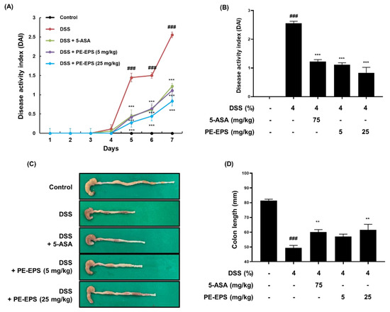 3.1. PE-EPS Restores Clinical Symptoms in DSS-Induced Colitis Mice