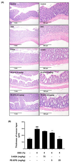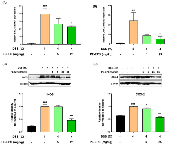 3.2. PE-EPS Decreases the mRNA and Protein Levels of iNOS and COX-2 in the DSS-Induced Colitis Mice