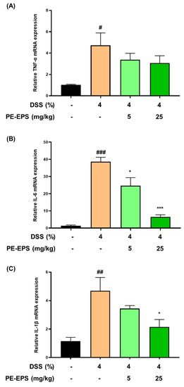 3.3. PE-EPS Suppresses Production of Pro-Inflammatory Cytokines of the DSS-Induced Colitis Mice
