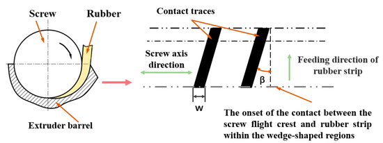 At the feed port, the basic screw configuration of the cold feed extruder is a single screw section with double-flighted design. When rubber strips pass through the feed wedge clearance, the screw flight crest will always contact and squeeze the rubber strip. If expanded along the outer diameter of the screw, the contact traces between the screw flight crest and the rubber strip are two inclined narrow strips (the black areas in Figure 2). In Figure 2, β is the helical angle and w is the axial width of the flight. To describe the behavior of the feeding process, the geometry of the helix feed wedge clearance is simplified, and then motion transformation is applied, as discussed in Section 3.1. As the rubber strip passes through the feed wedge clearance, the effective flight compression path is perpendicular to the screw axis. Therefore, each feed’s screw flight can be simplified to a disc (helical angle β = 0°), and the diameter and width of the disc are screw diameter D and screw flight axial width w, respectively. An effective feed wedge clearance is formed between the disc and the undercut groove on the inner wall of the feed barrel. In this way, a disc rotation squeezing model is built with a disc and a barrel (Figure 3). Because the two screw flights have the same geometry, one was chosen for mathematical description.