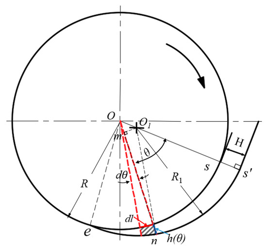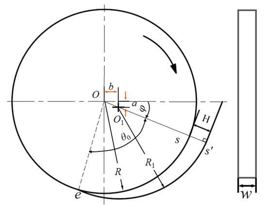 For all general specifications of cold-feed extruders, a standardized design of the feed wedge clearance has been achieved. In Figure 3, a = 0.03 − 0.04D, b = 0.06 − 0.08D, R = 0.5D, R1 ≈ 0.5D, is the start position or maximum value of the wedge gap (on the extended line of O and O1, that is ), is the end position or minimum value of the wedge gap (the typical value is 0.0045R), and is the center angle of the circular arc of the outer diameter of the disc in the whole range of the feed wedge clearance. For example, for a cold-feed extruder with D = 65 mm, a = 2 mm, b = 5 mm, R = R1 = 32.5 mm, H = 5.4 mm, hmin = 0.146 mm, and θ0 = 85° ≈ 1.483 rad.
