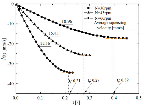 To study the change in instantaneous squeezing velocity, according to Equation (5), MATLAB software was used to calculate and draw curves at different disc speeds (N = 30, 45 and 60 rpm) for the disc rotation squeezing model of D = 65 mm (, R1 = 32.5 mm). Figure 5 shows that the curve is approximately composed of two parts: a constant acceleration squeeze in the early stage and a constant velocity squeeze in the later stage. The former accounts for most of the whole rotational squeezing process, and the latter accounts for a small part. Setting t0 and tt to represent the time used during the whole rotational squeezing process and the transition time from the constant acceleration squeeze to the constant velocity squeeze, respectively, t0 can be calculated according to the formula t0 = 30θ0/πN, and tt can be measured from the asymptotic transition part of the curve in Figure 5. When N = 30, 45, and 60 rpm, t0 is 0.47, 0.31, and 0.24 s, tt is 0.39, 0.27, and 0.21 s, and tt/ t0 is 0.83, 0.87, and 0.875, respectively. Figure 5 also shows that the squeezing velocity increases faster with increasing disc speed. Similar results can be obtained by using the same method to calculate other disc rotation squeezing models with different diameters (D = 90, 120, 150, 200, and 250 mm).