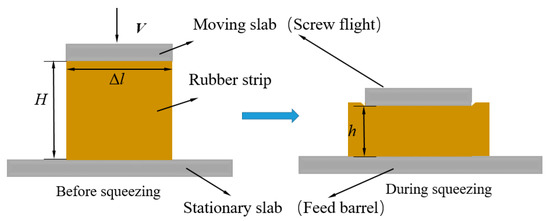 During the actual feeding process, the rubber strip that is adhered to the screw flight rotates with the rotational screw flight and slides along the barrel surface. Therefore, in the disc rotation squeezing model, the disc drags the rubber strip to rotate through an angle θ (rad) within time t, and the rubber strip is squeezed (compressed) from the initial thickness H to the thickness h(t). This process can be regarded as one in which a “differential slab” of arc length (Figure 4) squeezes the strip in parallel from the initial thickness H to the thickness h(t) within time t at the squeezing velocity generated by the disc rotation. The squeezing flow obtained from the kinematic exchange is called the differential slab squeezing flow, which is shown in Figure 6. Since screw flight is always embedded into the rubber strip during the feeding process, this flow belongs to a constant area squeezing flow [43].