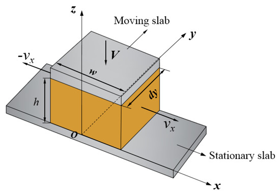 The theoretical analysis used the rectangular coordinate system shown in Figure 7. First, the following assumptions about the differential slab squeezing flow were made to solve the balance equations for the analytic solutions of the velocity and pressure distributions: