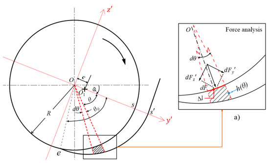 The total squeezing force can be deduced from the disc rotation squeezing model. The method for calculating is as follows: first, the coordinate system shown in Figure 9 was established, and the force acting on the area element () at position in the radial direction of the disc was decomposed into and components, as shown in the enlarged view. Second, the magnitudes of the and components of the total squeezing force were calculated by integral, that is, and . Finally, the magnitude and tangential direction angle of the total squeezing force were calculated, that is, and . is the angle between the direction of the total squeezing force and the horizontal line.