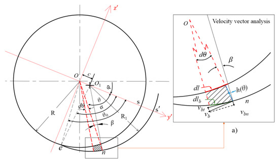 Equation (29) shows that, in the feeding process, the value of will change with or . Since the center and radius of the cylinder arc are and , respectively, the tangential velocity of the rubber element sliding along the cylinder at position is: