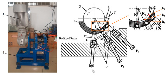 The pressure and power data obtained by using the disc rotation squeezing model device (Figure 11) were chosen. Test device: this model device comprises disc 2 driven by motor 1, semicylinder 4 with an eccentric undercut groove on the inner surface, pressure sensor 5, and a control system (which is not shown in the figure). The top surface of the disc, and the inner wall of the groove under the semicylindrical feed wedge clearance 6 and 7, using feeding rubber strips. The disc and drive device are supported by bracket 3. The DJYZ-10 cylindrical pressure sensors were installed in the upper (U), middle (M), and lower (L) positions of the semicylinder, and were used to measure the pressures of the rubber strip through the feed wedge clearance. The pressure sensor had a measurement range of 0–500 kg and a nonlinearity of 0.3–0.5%. The pressure and power data were automatically calculated, recorded, and stored by upper computer software. The disc speed was changed by a variable frequency speed-regulating motor. The temperature of the laboratory was set at 23 ± 2 °C. The geometric parameters of the model device are shown in Table 1.