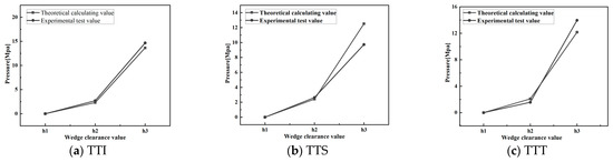 As mentioned in Equation (7), the pressure in the model wedge is isotropic. Therefore, the pressure in the radial direction in Figure 9 is equal to the pressures calculated by Equations (11) and (12). To simplify the calculation, the average pressure was used. Hence: