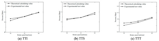 The value in Table 1, the value of different rubber compounds in Table 2, the value at different disc speeds, and the value at different positions were substituted into Equation (12) () to obtain the pressure distributions of different rubber compounds at different disc speeds. Figure 12 shows the pressure distribution of TTI, TTS, and TTT at N = 30 rpm. Figure 13 shows the pressure changes of TTI, TTS, and TTT in the position of mm at different disc speeds.