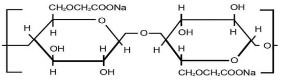 Carboxymethyl cellulose (CMC) is cellulose ester, which has attracted commercial importance since the 1920s []. The structure is shown in Figure 2. CMC may be prepared by simple synthetic methods from widely available raw materials. CMC is used in such applications as in the paper, textile, pharmaceutical field, cosmetic, and food industries []. CMC is mostly favored over other cellulose derivations due to its gelling, emulsifying, binding, and thickening properties. These significant features provide the CMC use in pharmaceutics, food, and other food-related industries such as pills, ice cream, drinks, toothpaste, and detergents []. CMC can be used in combination with other polymers. This fact is very important for the development of the matrixes for drug encapsulation for biomaterials, hydrogels, and nanoparticles [].