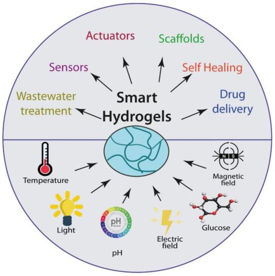 The main applications of hydrogels in the biomedicine field, like scaffolds for tissue engineering, actuators, drug delivery systems, biosensors, and many other applications, are reviewed [] (Figure 3).