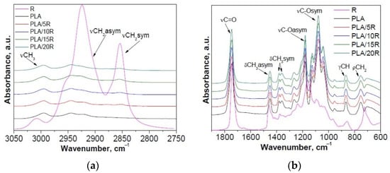 Normalized ATR-FTIR spectra of PLA/R samples compared with neat PLA and R: (a) 2750–3050 cm−1 and (b) 600–1900 cm−1 spectral range.