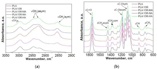 Normalized ATR-FTIR spectra of PLA/modified R samples compared with neat PLA and PLA/15R samples: (a) 2750–3050 cm−1 and (b) 600–1900 cm−1 spectral range.