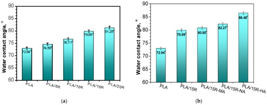 Figure 4a,b presents the WCA of PLA mixtures with natural and modified R. Pristine PLA sample presented a WCA of 72.94°.