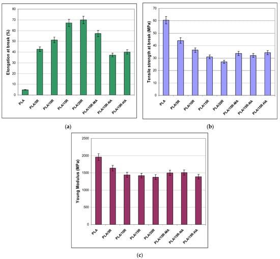 The results of the tensile tests for the neat PLA and PLA plasticized with different contents of unmodified R and 15 wt% anhydride–modified R are summarized in Figure 5. PLA is characterized by a high Young modulus and brittleness, limiting its use in specific applications. The aim of incorporating plasticizers in the PLA matrix is to reduce brittleness and enhance flexibility.