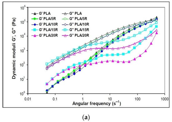 It is noticeable in Figure 6a that the slopes of G′ (ω) and G″ (ω) for PLA blended with the lowest amounts (5 and 10 wt%) of pure R were slightly lower than the values of neat PLA, while the highest pure R loadings of 15 and 20 wt% considerably changed the shapes of the slopes. In this latter case, both dynamic moduli, G′ and G″, present a slightly sinusoidal shape explained by a change in the material elasticity. Higher G′ values compared to neat PLA were found at low ω, up to 1 s−1, followed by a small “rubbery” plateau with independent G′ values function of ω and further increase of G′ values at high ω. Similar behavior has been reported for incorporating 15 wt% epoxidized soybean oil (USE) into the PLA matrix [43].