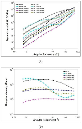 In the case of modified R, the Newtonian plateau is larger for PLA/R-MA and R-NA, while the sample PLA/R-HA also showed another plateau at higher ω (Figure 7b). The intermolecular interactions that occurred during blending melt led to macromolecular chains’ stabilization, and resistance to deformation could justify the plateau at higher oscillation frequencies [53].
