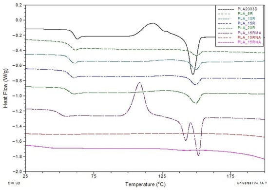 The thermal behavior of PLA and PLA containing modified and unmodified R has been assessed from the DSC curves recorded during the second heating, after cooling from the melt state (Figure 8), since the thermal history produced during processing was erased during the first heating. The thermograms recorded during the first run and cooling (Figure S3) are inserted in the Supplementary Materials.