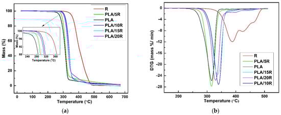 It can be seen both from the TG/DTG curves plotted in Figure 9 and the data shown in Table 4, respectively, that natural R is more thermally stable than PLA-containing ester groups. Therefore, the shifts to higher values of Tonset (Figure 9a, inserted graph), Tmax, and Ts show the improvement of the thermal stability of PLA/5R and especially PLA/10R sample, compared to neat PLA. This enhancement in thermal stability was also recorded for higher R fractions incorporated in the PLA matrix (PLA/15R, PLA/20R), with slightly lower thermal parameters related to PLA/10R. However, a higher thermal resistance when compared with PLA. The explanation of this behavior could be provided by R decomposition, which in the second stage of its mechanism involves an increase in ricinoleic acid degradation rate, leading to PLA matrix degradation. Moreover, this behavior is clearly noticeable in Figure 9b, where the second stage of the R decomposition mechanism becomes more evident for PLA matrix decomposition in samples PLA/15R and PLA/20R. As shown in Table 4, the mass loss value assigned to each second or third-stage decomposition mechanism for these samples is not negligible, which further supports our assumption. The DTG curves (Figure 9b) show that the sample containing 10 wt% R proves the highest thermal stability. But for this content of R and lower one (5 wt%), the rate of the degradation mechanism of PLA matrix slightly increases, a maximum mass loss being recorded.