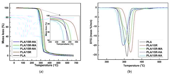 The obtained results regarding the R decomposition are similar to the ones reported by Mustata and Tudorachi in their work [37], where thermal degradation of R modified with three types of anhydrides has been investigated. According to the reported thermal degradation kinetic parameters, the order of thermal stability of R modified with cyclic anhydrides is R-HA > R-NA > R-MA. By melt blending of PLA with each of this modified R in a fraction of 15 wt%, the thermal stability of all samples decreased compared to the PLA blended with the same fraction of unmodified R (Figure 10).