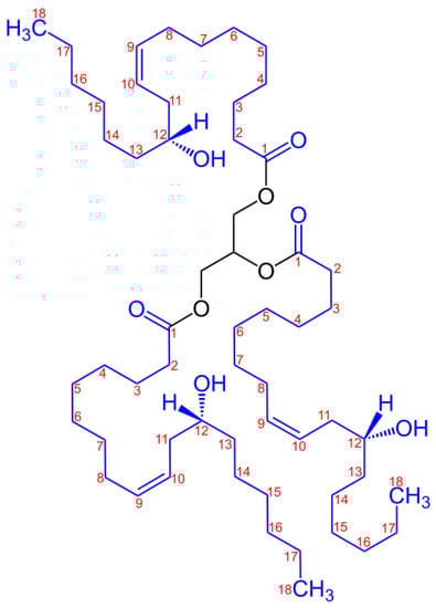 - Castor oil (Main Component Structural Formulae) V2.svg. (2022, August 11). Wikimedia Commons, the Free Media Repository. Available online: https://commons.wikimedia.org/w/index.php?title=File:Castor_oil_(Main_Component_Structural_Formulae)_V2.svg&oldid=681682598 (accessed on 27 August 2022).