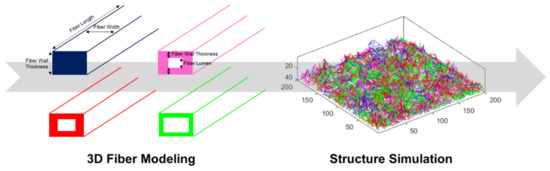 Representative scheme of 3D modeling and computational simulation approach, in which different fibers are represented with different colors. The fibers are modeled according to their dimensions and properties, considering the three fiber dimensions. Modeling is detailed to the point where fiber wall thickness, fiber lumen, flexibility, and degree of collapse are considered. The models consist of fibers without lumen and with different lumen dimensions [46]. Finally, 3D structures are simulated from these proposed models in order to predict structural properties and, consequently, optimize functional properties.