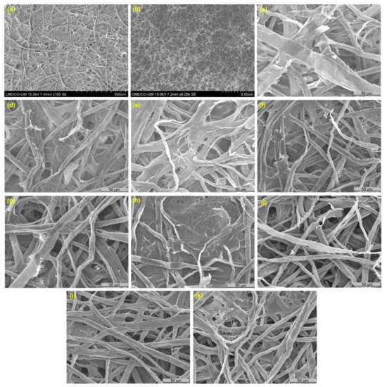 The morphological properties of MFC fibers were evaluated automatically by a system based on image analysis, the MorFi Analyzer (TECHPAP, Grenoble, France) of a diluted suspension of 20 mg/L in a flow chamber. The studied parameters included the number of fibers, fiber length weighted by length, fiber width, coarseness, kinked fibers, curl, rate of macrofibrils, and fines elements content [40]. The results were determined in triplicate. Additionally, the scanning electron microscopy (SEM) method was also used to characterize the MFC structure, using a Hitachi S3400 N-II model (Tokyo, Japan), with 20 kV accelerating voltage at different magnifications. An MFC laboratory-made structure was prepared to perform this analysis, being initially coated with gold using a Sputter Quorum Q 15 OR ES (Laughton, East Sussex, UK). The method for preparing laboratory structures is shown below.