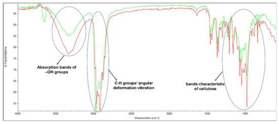 Additionally, the MFC chemical functional groups were identified using the FTIR-ATR method (Figure 4). Eucalyptus globulus kraft pulp was also analyzed since it is the starting point for obtaining MFC. Both samples were used to prepare laboratory-made structures and, consequently, to perform this analysis. Both FTIR spectrum showed the bands characteristic of cellulose [48,49]: angular deformations of C–H groups (~1374 cm−1), angular deformation of primary alcohols C–O bonds (~1164 cm−1), the absorption band of C–O–C bonds (~1015 cm−1), and β-glycosidic bonds between glucose units (~888 cm−1). The typical absorption bands of –OH groups at ~3336 cm−1 and C–H groups’ angular deformation vibration between 2880 and 2980 cm−1, approximately, were also verified. As dry laboratory-made structures were used in this analysis, the broadband at ~3336 cm−1 was not as visible, since the ability of the MFC sample to absorb more water can be demonstrated by the increase in the broad hydroxyl band. Despite this evidence, the main differences are found in these two bands, with the MFC sample presenting a higher band area and intensity. These results are in agreement with the chemical properties presented as well as the fiber modification treatments applied.