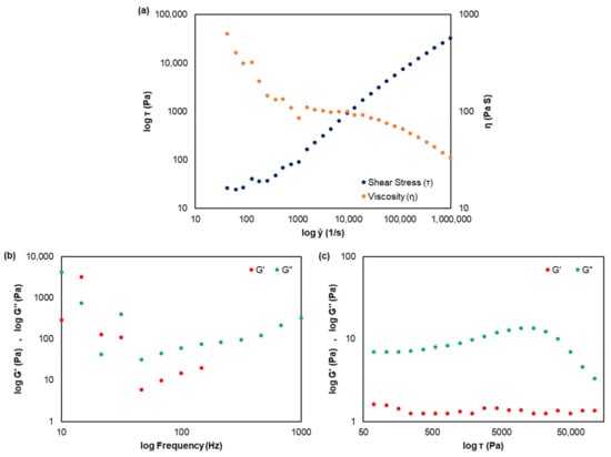 Rheological analysis of CMC/EO (5 mg/mL) at 23 ± 1 °C: shear stress and viscosity as a function of shear rate (a); storage and loss modulus as a function of frequency (b); and storage and loss modulus as a function of shear stress (c).