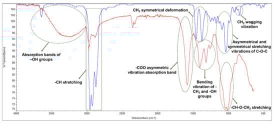 FTIR-ATR spectrum of CMC (red) and EO (blue).