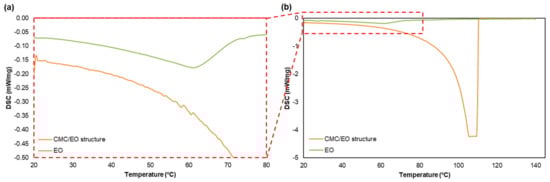 Comparison of DSC of the CMC/EO structure and the eucalyptus essential oil alone, (a) between 20 and 80 °C and (b) 20 and 140 °C.