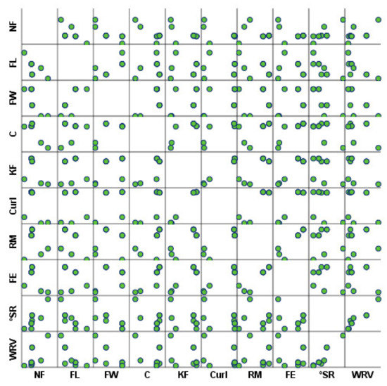 The relationships between each fiber morphology and water interaction properties were also investigated using Pearson’s correlation matrix analysis (Table 5 and Figure 8). It was found that a total of 10 and 28 of the 100 pairwise correlations were considered significantly correlated at 0.05 and 0.01 levels, respectively. The direct and inverse relationship of each variable is determined by the positive or negative Pearson correlation coefficient, respectively. The p-value lower than 0.05 associated with this coefficient implies that the variables present a statistically significant association [64]. The interest relationships included the direct correlations between fiber width, coarseness, kinked fibers, curl, rate of macrofibrils, and fine elements, and inverse correlations between the number of fibers, fiber width, and coarseness. Furthermore, the °SR and WRV presented a direct association with the number of fibers and an inverse association with fiber length and width. Both parameters also showed a statistically significant positive association.