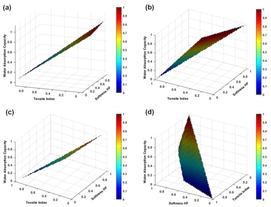 With this analysis, it was also possible to predict the influence of the amount of softwood fibers and MFC on the evolution of functional properties (Figure 9d). Two examples of these predictions can be highlighted: (1) structures produced with 90% hardwood fibers, 7% softwood fibers, and 3% MFC, and (2) structures produced with 90% hardwood fibers, 3% softwood fibers, and 7% MFC. The results of the first prediction indicated that structures with 69.1 of softness HF, 11.5 Nm/g of tensile index, and 6.8 g/g of water absorption capacity can be obtained. The structures produced with the second prediction showed softness HF of 65.1, tensile index of 12.4 Nm/g, and water absorption capacity of 6.7 g/g. These mathematical predictions can evaluate various scenarios in order to optimize the furnish process, and design and develop new materials, saving laboratory and industrial resources, in a quick and flexible response [44,47].