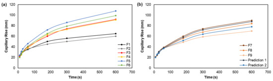 Evolution and prediction of capillary rise from F1 to F6 (a), and F7 to F9 (b).