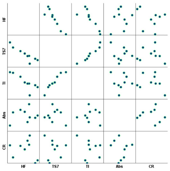 A correlation matrix detailing the relationship between each functional property was also assessed, as displayed in Figure 11. Statistically significant direct correlations included softness TS7 for tensile index (0.982, p-value < 0.01), while statistically significant inverse correlations included softness HF for softness TS7 (−0.913, p-value < 0.01) and tensile index (−0.827, p-value < 0.01). This result is expected since higher softness HF values are associated with lower softness TS7 values, and consequently, lower tensile index values [67]. It should also be noted that no statistically significant relationship was obtained between the water absorption capacity and capillary rise properties. This result indicates that several morphological, chemical and physical factors are contributing to the absorption properties, and, therefore, non-associated correlations were obtained with the softness and strength properties.