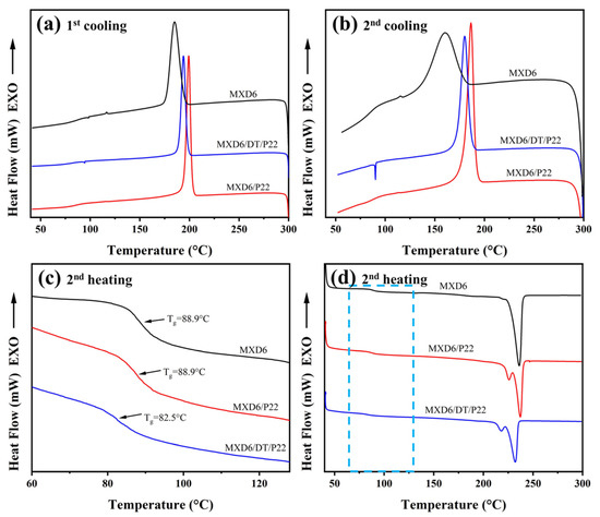 DSC curves of neat and modified MXD6: (a) first cooling (10 °C/min) ramp, (b) second cooling (40 °C/min) ramp and (c,d) second heating (10 °C/min) ramp.
