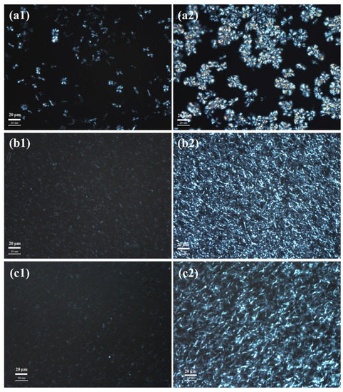 The POM pictures of isothermal crystallization of (a1,a2) MXD6, (b1,b2) MXD6/P22, (c1,c2) MXD6/DT/P22 at 216, 220 and 213 °C at 5 and 10 min, respectively.
