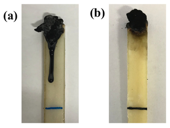 Here, we evaluate the flame retardancy of the neat MXD6 and the modified MXD6 by LOI and CCT tests. Figure 4 shows the digital images of the material strips that remained after the LOI tests. It is measured that the neat MXD6 has an LOI value of 26.4%, less than the level ruled for the flame-retardant materials (>28%). These data indicate that the flame retardancy of MXD6 must be improved before it is used in practical applications. In addition, there is a heavy melt-dripping for the neat MXD6 during combustion, as shown in Figure 4a. When 11.0 wt.% DT together with 0.1 wt.% P22 (DT/P22) is added to MXD6, the LOI value of this modified MXD6 is 33.4%, meaning excellent flame retardancy. It is also important that the original melt-dripping is nearly completely suppressed in the modified MXD6, as shown in Figure 4b. The large improvement in the flame retardancy is attributed to the synthesized DT component here because the content of P22 is too low at 0.1 wt.%.