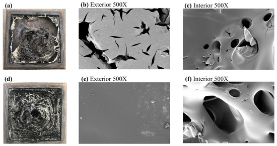 Digital and FESEM images of CCT residual chars, (a–c) neat MXD6 and (d–f) MXD6/DT/P22.