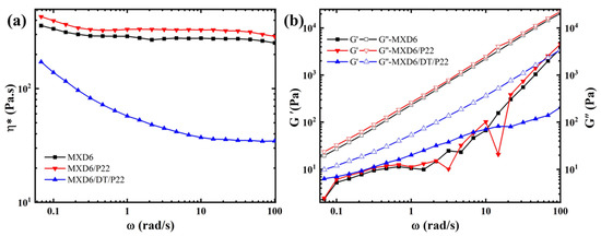 Figure 8 shows the complex viscosities (η*), storage modulus (G′) and loss modulus (G″) of the samples as a function of angular frequency at 250 °C. When DT/P22 composite is added, the modified MXD6 has a low complex viscosity [48] and shows obvious “shear thinning” behavior as compared to neat MXD6 (Figure 8a). As shown in Figure 8b, the G″ of all samples is greater than their respective G′. In the low-frequency region (ω < 10 rad/s), the G′ of MXD6/DT/P22 is higher than that of neat MXD6 but significantly lower than neat MXD6 at higher frequency (ω > 10 rad/s). DT is a polar polymer of low molecular weight. There should be strong interactions between DT and the amide groups in MXD6 chains [37]. In the melt blend, the intramolecular interactions among the MXD6 chains are weakened due to the presence of DT, and the entanglement of MXD6 chains also turns weak. Due to this plasticization effect, the viscosity of MXD6 melt drops obviously, and the melt blend has different rheological properties from the neat MXD6 resin.