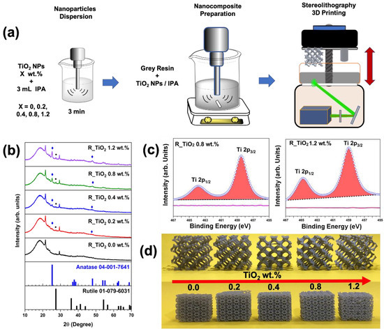 (a) Schematic representation of how to achieve stereolithographically 3D-printed polymer nanocomposites based on resin/TiO2 NPs (R_TiO2 X wt.%) at several concentrations of TiO2 NPs (0.0, 0.2, 0.4, 0.8, and 1.2); (b) XRD patterns for all 3D-printed nanocomposites; (c) HR-XPS curves corresponding to polymer nanocomposites at 0.8 and 1.2 wt.% TiO2 NPs; and (d) printability demonstration of hollow structures (gyroid type), compression test specimens, and complex structures (dense lattices).